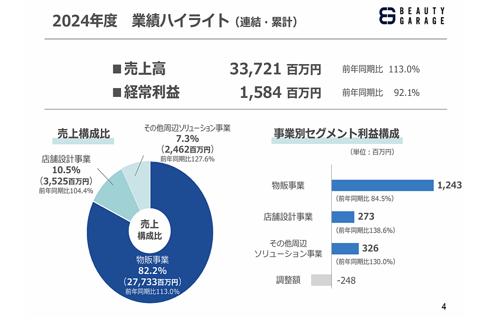 売上拡大の原動力となったのは、主力である物販事業だ。理美容機器・化粧品・消耗品などを、ECサイト「BEAUTYGARAGE Online Shop」や全国主要都市のショールームを通じて、理美容室・エステ・ネイル・アイラッシュといったプロ向けに提供している。2025年4月期の物販事業の売上高は277億3,300万円(同+13.0%)と好調に推移した。ECサイトの機能強化、品揃えの拡充、物流拠点の整備が奏功した形だ。