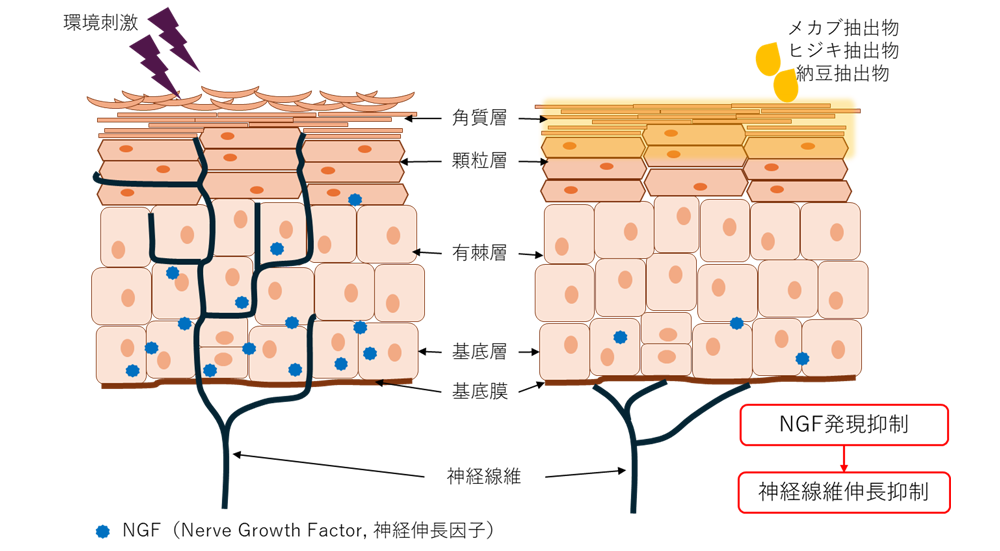 今回の研究は、かゆみの発生に関わる神経伸長因子(NGF)に着目。NGFは表皮で発現し、神経線維を皮膚内に伸ばす役割を担っており、かゆみの感覚と密接な関係がある。紫外線や乾燥、花粉、黄砂といった環境要因がこのNGFの発現を促進し、知覚神経の侵入を許すことで「かゆみスパイラル」を引き起こすとされる。こうした背景から、日華化学はNGFの発現を抑える成分の探索に取り組んだ。