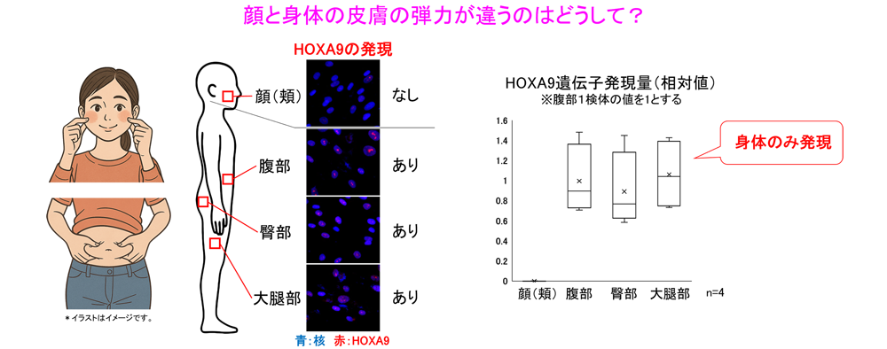 顔よりも腹部や臀部などの皮膚に弾力があるのは、HOXA9遺伝子の発現量に起因する可能性が高いと研究チームは結論づけた。今回の成果は、皮膚の弾力性に関する基礎研究の進展に寄与するだけでなく、エイジングケアやスキンケア製品開発の科学的裏付けとして活用される見通しだ。