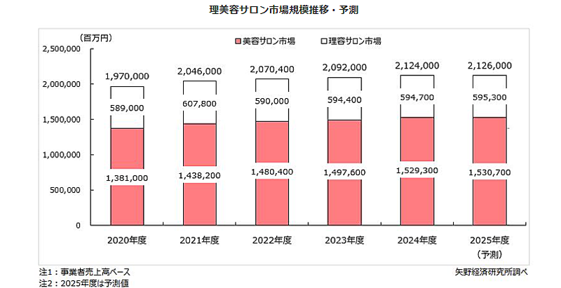 こうした状況の中、矢野経済研究所は2025年度の理美容サロン市場規模を前年比ほぼ横ばいの2兆1,260億円と予測している。内訳としては、理容サロン市場が5,953億円、美容サロン市場が1兆5,307億円で、いずれも前年比100.1%という微増となる見通しだ。