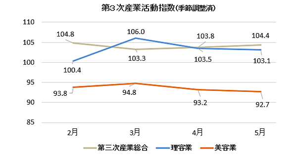 経済産業省は2025年7月15日、2025年5月分の第三次産業活動指数(2020年=100、季節調整済)を公表した。理容業・美容業ともに前月比でマイナスとなった。