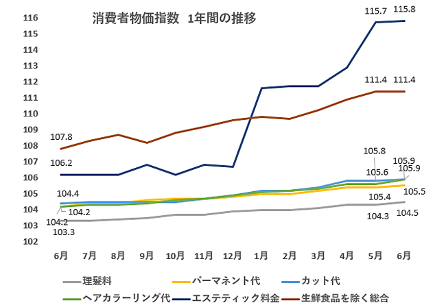 一方、エステティック料金を除く各サービスでは、パーマネント代、カット代、ヘアカラーリング代が横並びの指数を示す中、理髪料のみが一段低い水準にとどまっている。