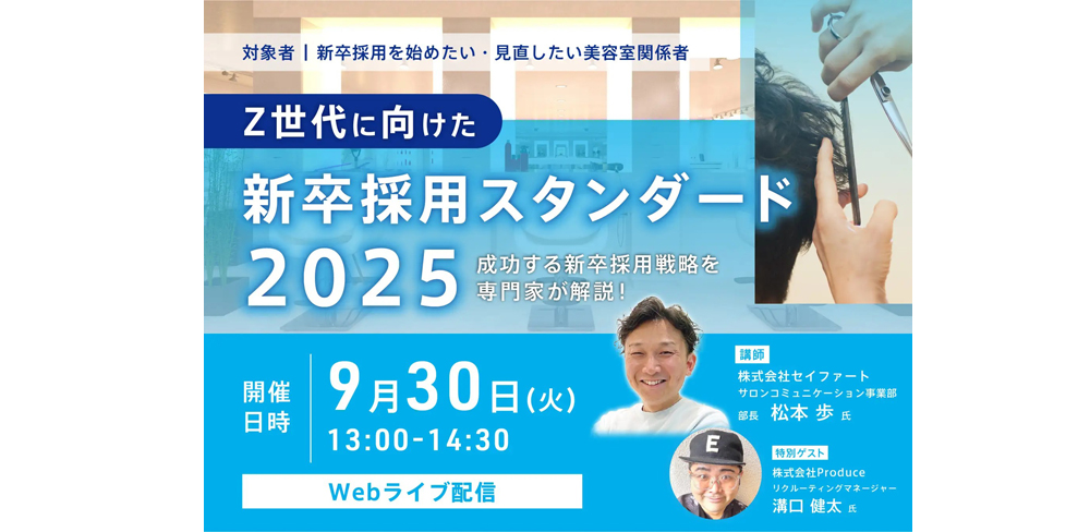 M&A仲介の株式会社ストライクは、株式会社セイファートと共催で、美容室経営者向けオンラインセミナー「Z世代に向けた新卒採用スタンダード2025」を2025年9月30日13時から開催する。