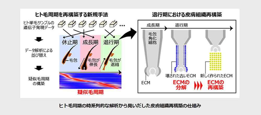 理化学研究所(理研)生命機能科学研究センターの藤原裕展チームディレクターと、ポーラ化成工業株式会社フロンティアリサーチセンターの横田絢副主任研究員らの共同研究チームは、ヒト毛周期の時系列的な1細胞遺伝子発現解析手法を開発し、これまで未解明だった皮膚組織の再構築メカニズムの一端を明らかにした。