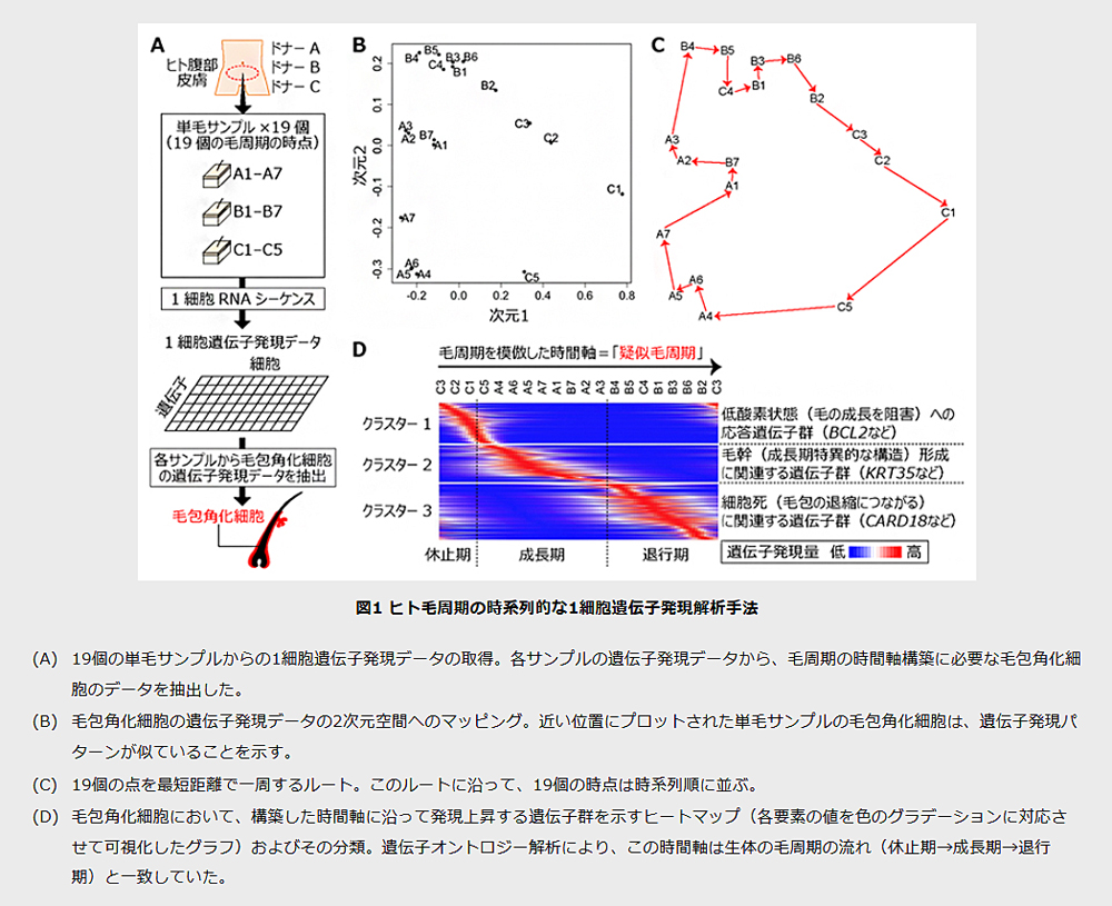 共同研究チームは、毛包を一つだけ含むヒト皮膚組織片19個を用い、1細胞ごとの遺伝子発現データを取得した。各データを比較・解析することで、毛周期の流れを再現する「疑似毛周期」を構築し、直接観察が難しい毛周期に伴う細胞の変化を時系列的に追跡することに成功した。