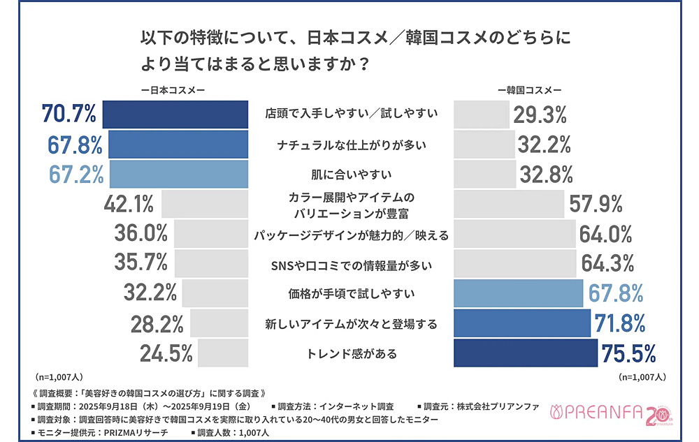 また、日本コスメとの比較では、「トレンド感がある」「新しいアイテムが次々と登場する」「価格が手ごろで試しやすい」が韓国コスメのトップ3評価。一方、日本コスメが韓国コスメを上回った項目は「店頭で入手しやすい/試しやすい」「ナチュラルな仕上がりが多い」「肌に合いやすい」だった。