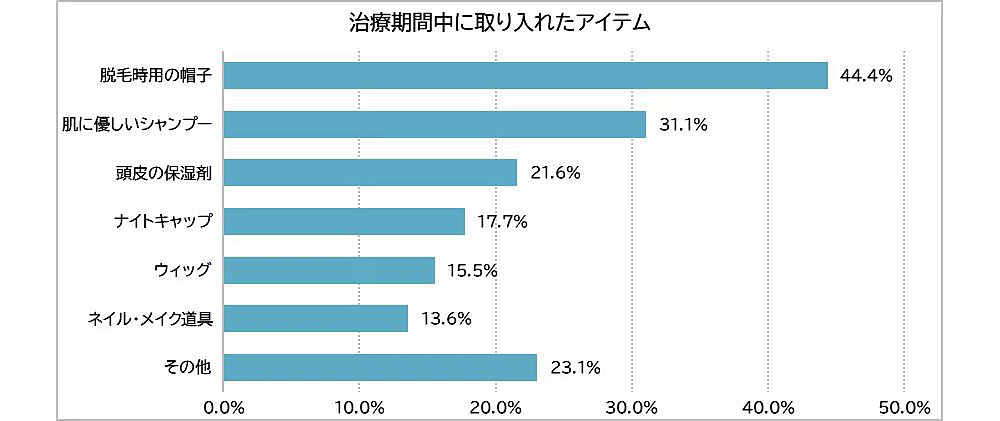 脱毛によって心理面や行動に変化があったと回答した人は約4割に上り、見た目の変化がメンタル面に与える影響の大きさがうかがえる。また、治療期間中に取り入れたアイテムとしては、「脱毛時用の帽子」(44.4%)が最も多く、外見をカバーしながら防寒や紫外線対策にも役立つ実用的なアイテムとして活用されていた。