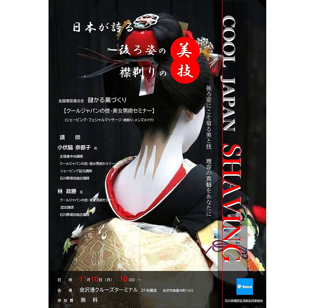 石川県理容生活衛生同業組合は2025年11月10日、金沢市の金沢港クルーズターミナル会議室で、シェービングをテーマにした「クールジャパンの技・美女男術セミナー」を開催した。