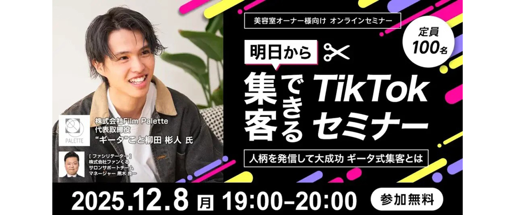 株式会社ファンくるは、株式会社Film Paletteの柳田氏を講師に迎え、「明日から集客できるTikTokセミナー~人柄を発信して大成功 ギータ式集客とは~」を2025年12月8日(月)に開催する。