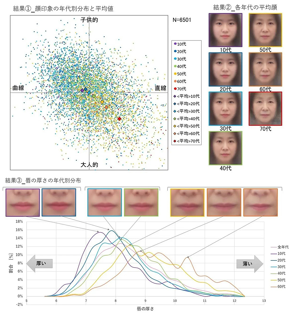 ──年代が上がるにつれ、唇は薄くなり、目は垂れ気味になり、顎はより丸く、パーツの配置は縦長へと変化する(いわゆる中顔面の伸長)傾向が確認された。また、加齢とともに個人差が拡大する可能性も示唆された。