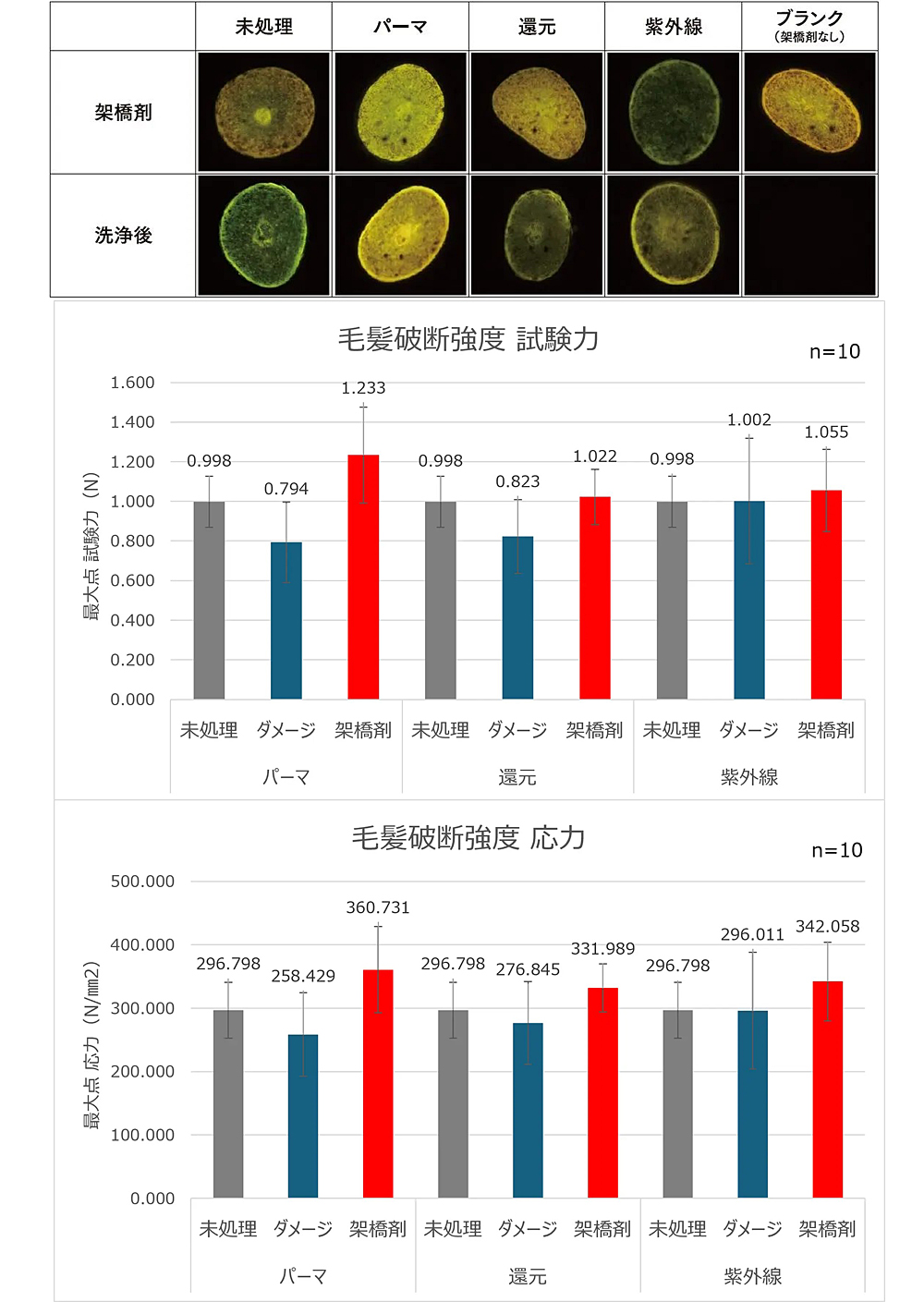 研究では、架橋剤「ジマレイン酸プロピレンジアンモニウム」がダメージを受けた毛髪内部に浸透し、切断されたシスチン結合を再び結び直すことを確認した。さらに、この成分は洗浄後も毛髪内部に留まることが検証されている。