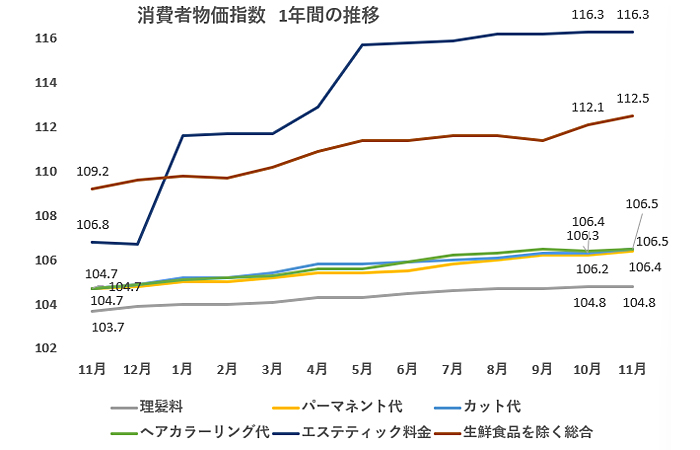 前月比では、理髪料とエステティック料金は横ばいだった一方、パーマネント代、カット代、ヘアカラーリング代は上昇した。生鮮食料品を除く総合指数は前月比で0.4ポイント上昇している。