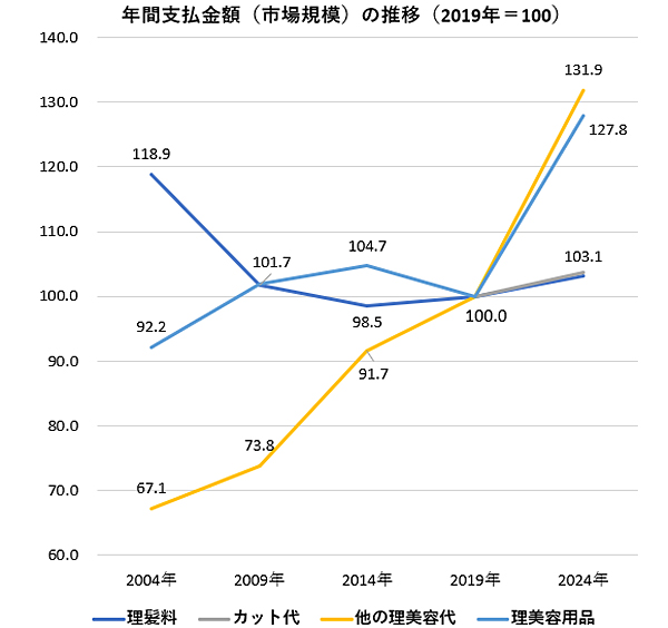 同調査は2004年分から公開されており、2019年を100とした指数で長期推移をみると、理髪料は118.9から103.1、パーマネント代は385.3から78.8、他の理美容代は67.1から131.9、理美容用品は92.2から127.8となっている(グラフ)。とくにパーマネント代の落ち込みが大きい。なお、他の理美容代については、2019年調査からカット代が独立するなど内包する細分類が変化しており、参考値として捉える必要がある。
