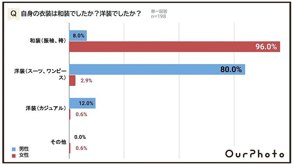 女性に圧倒的に多い和装だが、「着付けや美容院の時間が延びてしまった」(22.6%)、「振袖だと食事がまともにできない」といった声もあり、和装ならではの苦労も見られる。