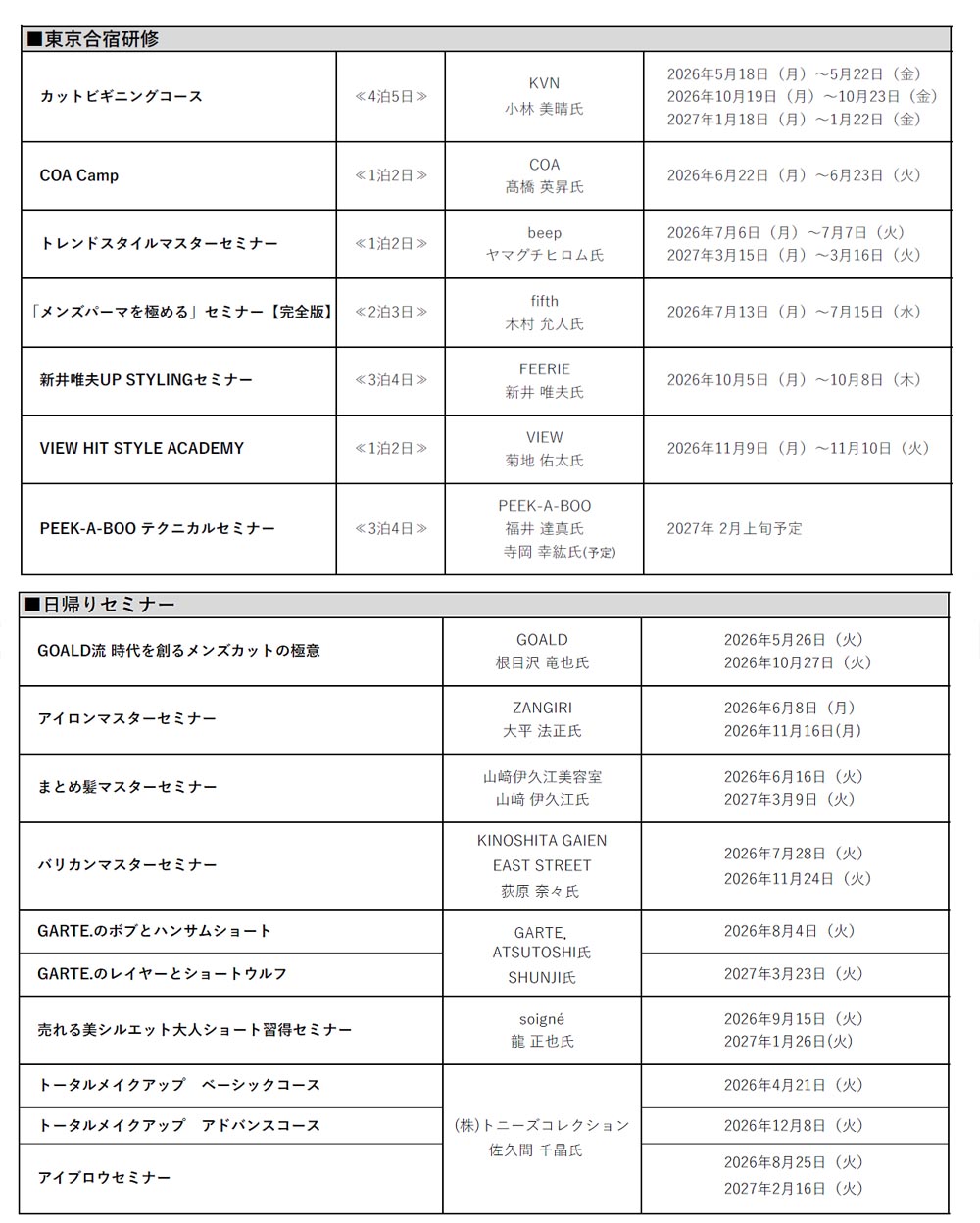 2026年度は、目的や経験値に応じて選べる2つのカテゴリーで多彩なセミナーを展開する。ブランクのある技術者から、さらなるスキルアップを目指すプロまで、サロンワークに直結する技術習得を想定した内容となっている。