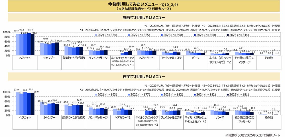 今後利用してみたいメニューは施設・在宅ともに「ヘアカット」が最多。以下「シャンプー」「髭剃り・うぶげ剃り」と、施設・在宅ともに同じメニューが続く。