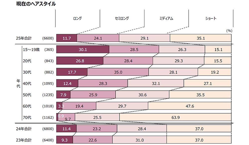 現在のヘアスタイルは、短い順に「ショート(35.1%)」「ミディアム(29.1%)」「セミロング(24.1%)」「ロング(11.7%)」だった。年代が上がるほど「ショート」が増え、「ロング」「セミロング」は減少する傾向があり、ショートは60代で47.6%、70代で63.9%に達した。