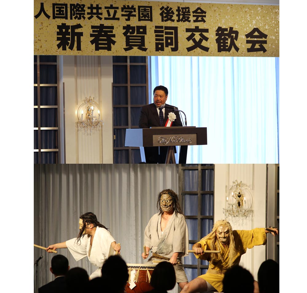 国際共立学園が新春賀詞交歓会を開催、御陣乗太鼓で祝賀