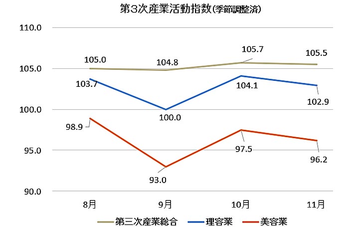 美容業指数96.2、6カ月連続で100割れ 【第三次産業活動指数 2025年11月】