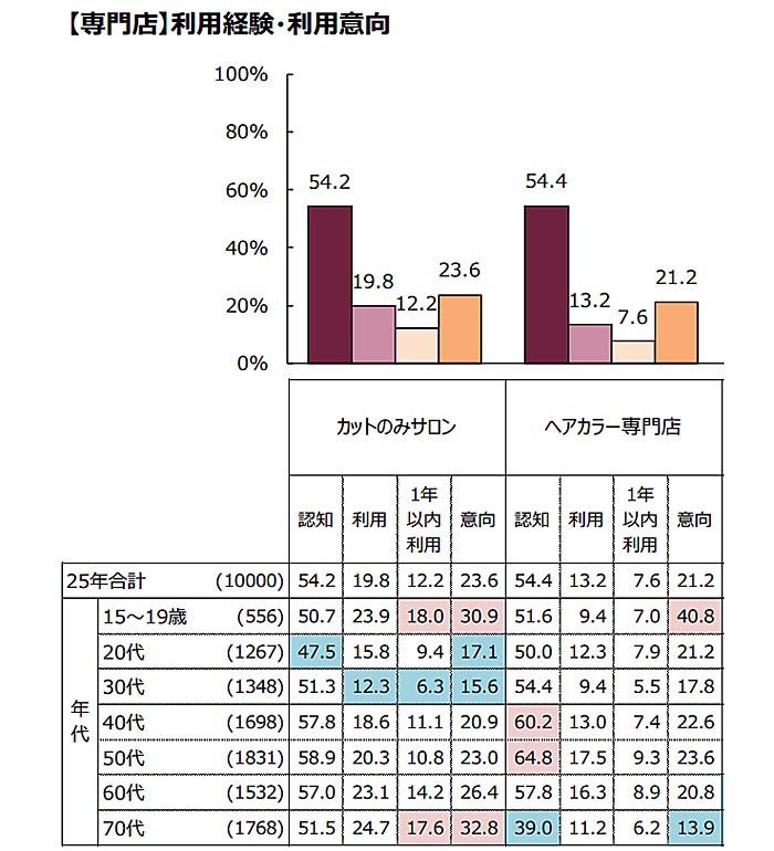 専門店の認知度を見ると、カット専門店は54.2%、ヘアカラー専門店は54.4%と、いずれも半数以上の女性が存在を認識していた。これまでに利用した経験がある女性は、カット専門店が19.8%、ヘアカラー専門店が13.2%だった。