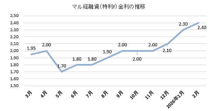 日本政策金融公庫は2026年2月2日付けで貸付金利を改定を発表した。長期金利の上昇を受けてマル経融資(特利F)は3か月連続して上昇し年2.40%になった。