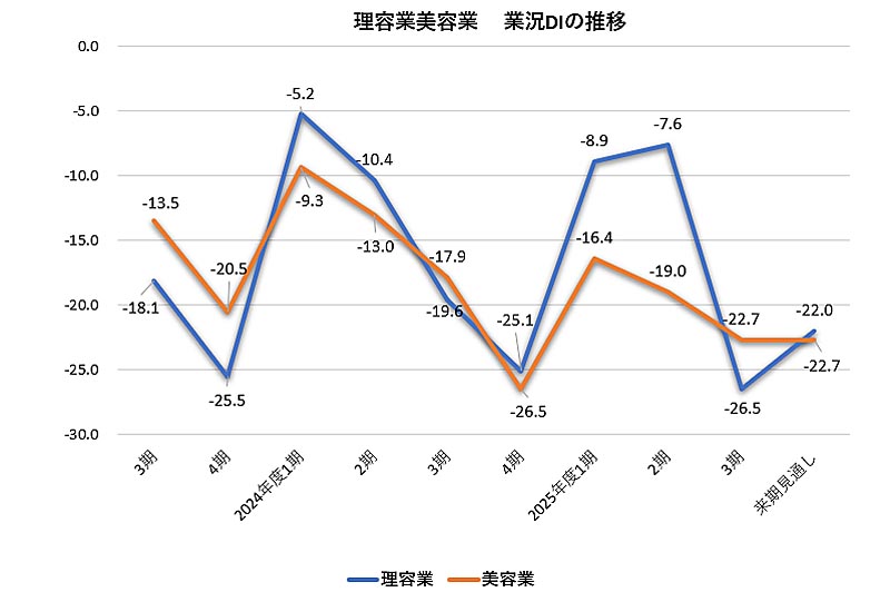 前年同期比でも両業種ともに悪化しており、業況の来期見通しは理容業、美容業ともにマイナス22ポイント台と厳しい水準にある。現時点では好転は期待しにくい状況だ。
