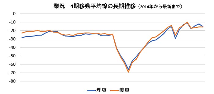 長期傾向としては、2014年から直近までの理容業・美容業の業況DI(4期移動平均線)を見ると、コロナ禍で大きく落ち込んだ(2020年第4四半期)ものの、長期的には両業とも緩やかな回復傾向にあるものの、この1年半は横ばい状態となっている。