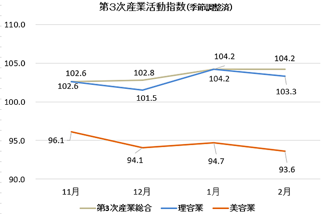 美容業の低迷続く<第3次産業活動指数2026年2月>