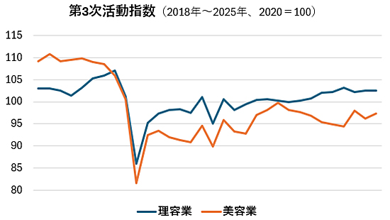 第3次産業活動指数は、理美容業を含む3次産業全体の経済動向を把握するための基幹統計で、毎月速報値が公表されるが、過去データは後日修正されることが多い。